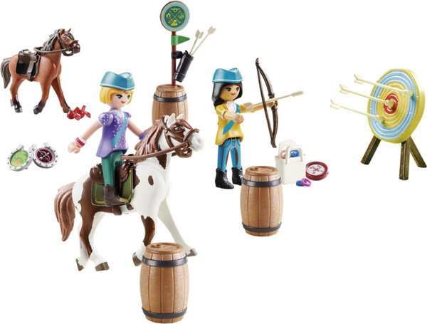 Obstacle avec canons et tir à l'arc. Avec Abigail & Boomerang et Ursula avec cheval Bing Cherry. Extra: Bracelet d'amitié pour enfants avec badge en fer à cheval à collectionner "